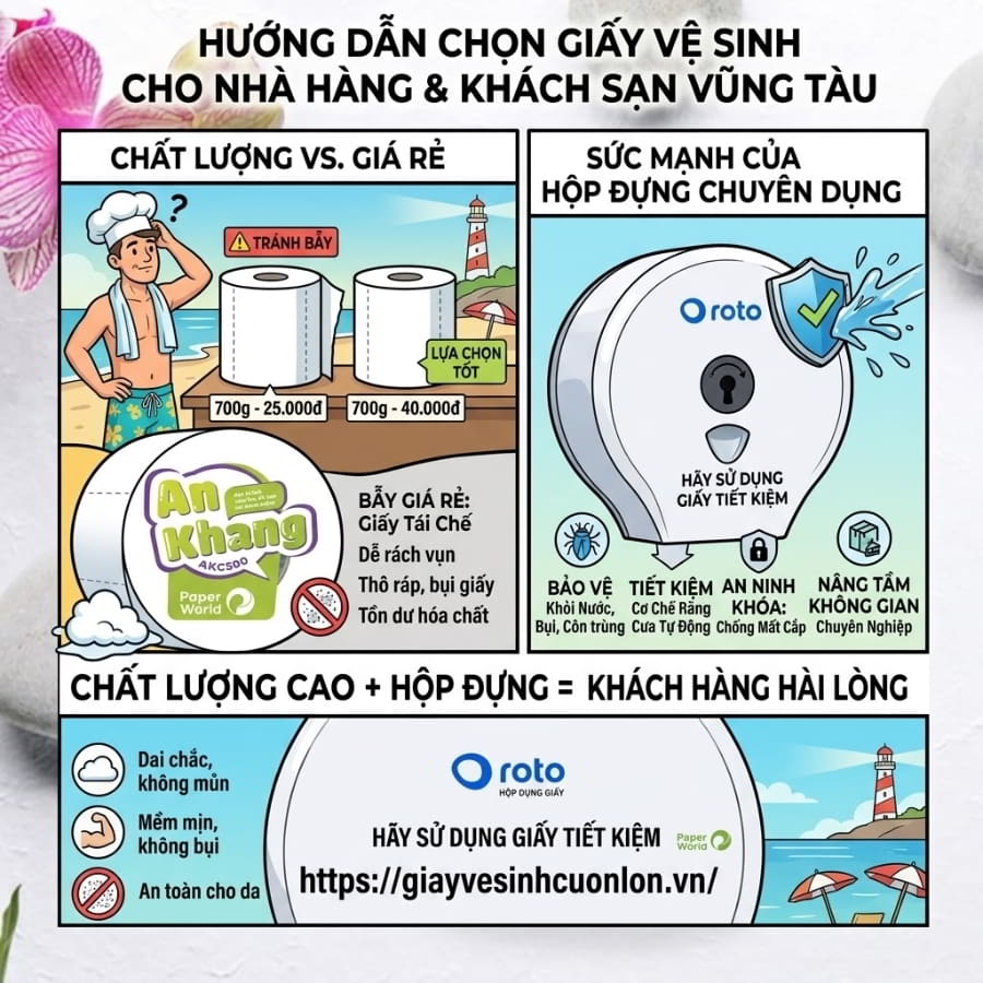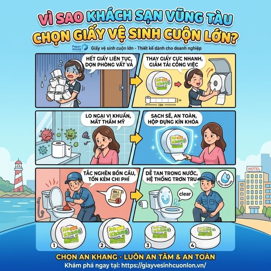 Ngành dịch vụ lưu trú (Hospitality) tại Vũng Tàu luôn đặt tiêu chuẩn cực kỳ khắt khe về trải nghiệm khách hàng. Mỗi chi tiết nhỏ trong phòng tắm, từ chiếc khăn tắm đến cuộn giấy vệ sinh, đều âm thầm định hình đẳng cấp của khách sạn. Vậy tại sao 100% các resort và khách sạn từ 3 đến 5 sao đều từ bỏ giấy cuộn nhỏ truyền thống để chuyển sang dùng giấy vệ sinh cuộn lớn cho khách sạn?