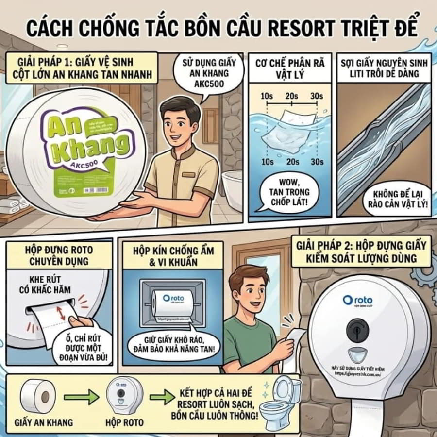 Hình ảnh một kỳ nghỉ dưỡng hoàn hảo tại “thủ phủ” resort Phan Thiết có thể bị phá hủy hoàn toàn chỉ bởi một chiếc bồn cầu bị nghẹt ứ, bốc mùi và trào ngược. Bất chấp đội ngũ Housekeeping của bạn làm việc chăm chỉ đến đâu, nếu khách hàng liên tục vứt những cuộn giấy vệ sinh kém chất lượng, dai như ni-lông vào toilet, hệ thống ống nước sớm muộn cũng sẽ “kêu cứu”. Thay vì đi tìm các loại hóa chất thông tắc độc hại hay tốn hàng chục triệu đồng thuê thợ sửa chữa như các hướng dẫn thông thường trên mạng, những nhà quản lý Horeca thông thái hiện nay áp dụng một chiến lược khôn ngoan hơn: “Phòng bệnh hơn chữa bệnh”. Chìa khóa vàng cách chống tắc nghẽn bồn cầu resort Phan Thiết ở đây chính là chuyển đổi sang sử dụng giấy vệ sinh cuộn lớn công nghiệp có đặc tính tan siêu nhanh trong nước.