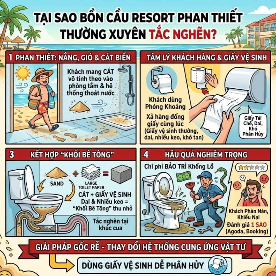 Phan Thiết, với đặc thù là vùng đất của nắng, gió và cát biển, mang đến những thách thức vận hành buồng phòng rất riêng. Khi khách lưu trú trở về từ bãi biển, một lượng lớn cát thường vô tình theo vào phòng tắm và hệ thống thoát nước. Khi lượng cát này kết hợp với một lượng khổng lồ giấy vệ sinh thông thường (loại giấy tái chế dai, chứa nhiều keo kết dính và khó phân hủy), chúng tạo thành những “khối bê tông” thu nhỏ ngay tại các khúc cua của đường ống bồn cầu.