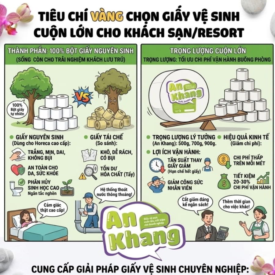 Đặc biệt, với tệp khách hàng nghỉ dưỡng tại các resort 4-5 sao, việc sử dụng giấy vệ sinh kém chất lượng sẽ lập tức tạo ra cảm giác rẻ tiền và thiếu sự trân trọng. Một cuộn giấy 100% bột giấy nguyên sinh không chỉ mềm mại, không gây kích ứng mà còn đáp ứng tiêu chuẩn phân hủy sinh học tự nhiên cực kỳ cao. Khi bạn đặt sức khỏe người dùng và khả năng bảo vệ hệ thống thoát nước lên bàn cân, dòng giấy vệ sinh cuộn lớn nguyên sinh tự nhiên chính là khoản đầu tư sinh lời vượt trội, giúp ngăn chặn từ xa chi phí thông tắc tốn kém.