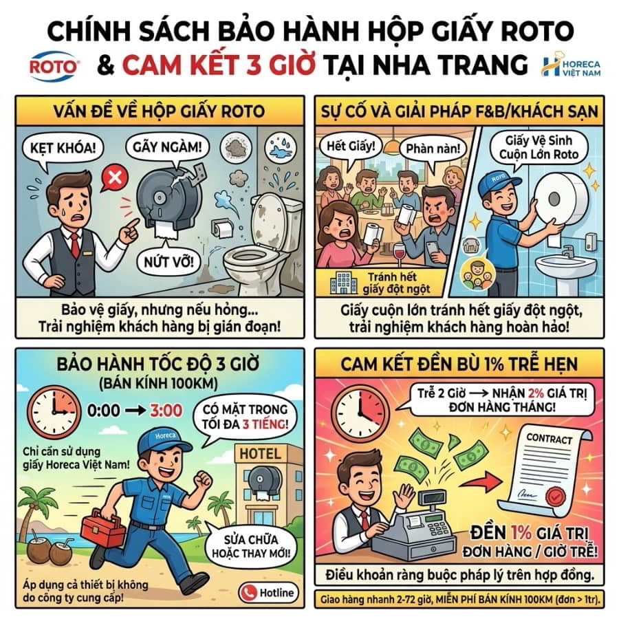 Để giải quyết triệt để nỗi lo đó, chúng tôi mang đến một đặc quyền chưa từng có trên thị trường cung ứng vật tư. Chúng tôi bảo hành thiết bị trong 3 giờ (bán kính 100km), kể cả thiết bị không do Horeca Việt Nam cung cấp nếu đang sử dụng giấy của công ty. Nghĩa là, chỉ cần bạn đang sử dụng giấy vệ sinh của chúng tôi, ngay khi bạn báo sự cố qua Hotline, đội ngũ kỹ thuật tại chi nhánh Nha Trang sẽ có mặt trong vòng tối đa 3 tiếng đồng hồ để sửa chữa hoặc thay mới thiết bị. Không cần chờ đợi qua ngày, không làm gián đoạn việc phục vụ khách lưu trú, mọi thứ được khôi phục trạng thái hoàn hảo với tốc độ của một dịch vụ 5 sao.