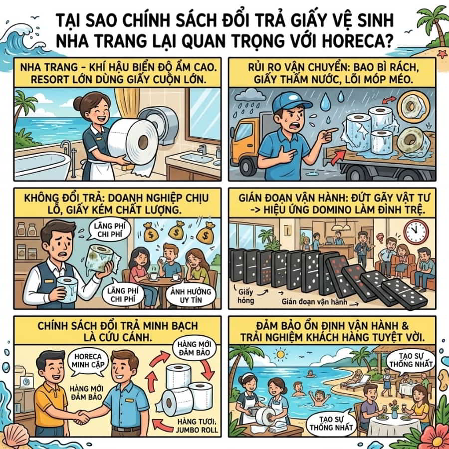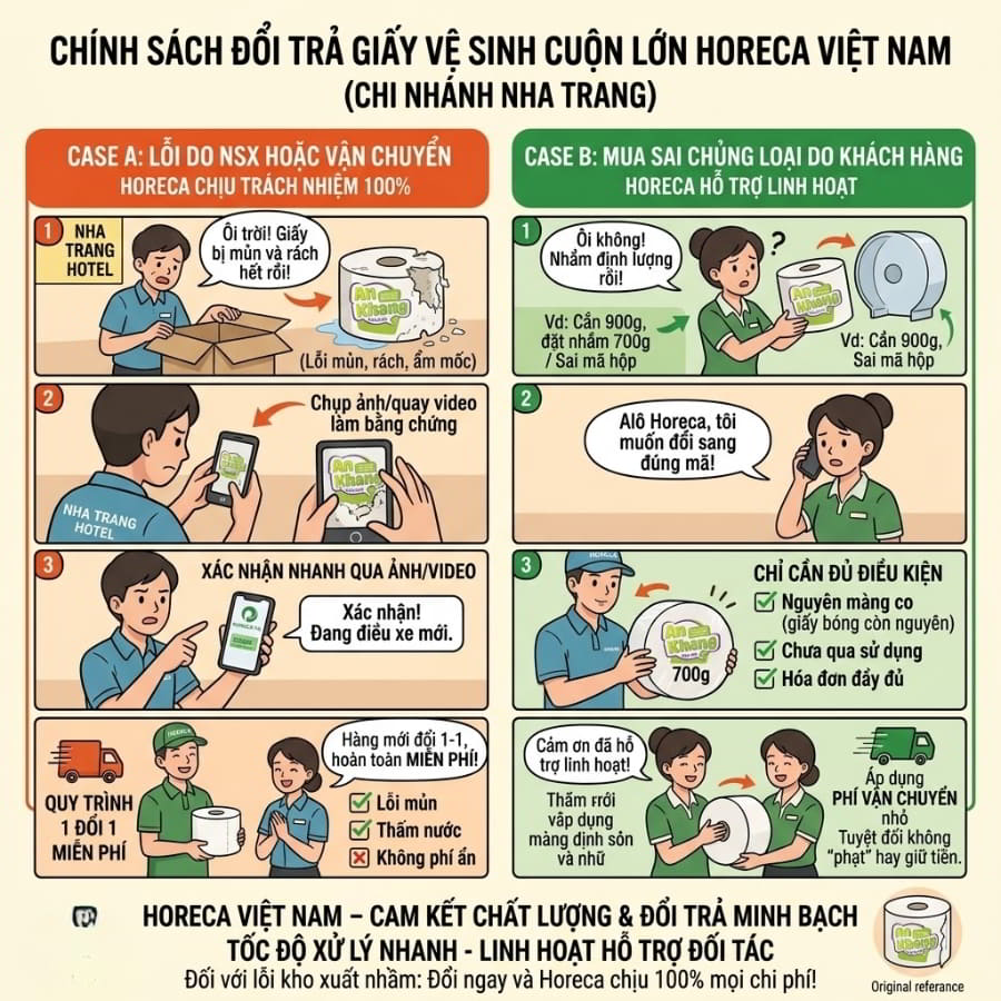 Một trong những nguyên tắc cốt lõi giúp Horeca Việt Nam giữ vững vị thế dẫn đầu là sự minh bạch và nhận trách nhiệm tuyệt đối về chất lượng sản phẩm cho đến khi hàng an toàn nằm trong kho của bạn. Chúng tôi hỗ trợ đổi trả nếu sản phẩm phát sinh lỗi do vận chuyển hoặc bảo quản. Nếu lô giấy vệ sinh cuộn lớn tại Nha Trang của bạn gặp tình trạng xơ cứng, mủn giấy do lỗi sản xuất, hay bị thấm nước, rách nát do quá trình bốc xếp vận chuyển, chúng tôi sẽ lập tức áp dụng quy trình 1 đổi 1.