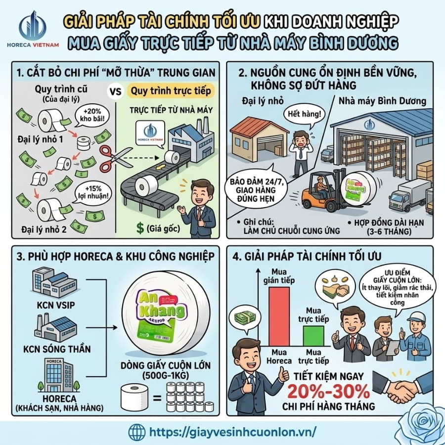 Vậy lối thoát nào cho bài toán ngân sách và vận hành này? Câu trả lời nằm ở việc cắt đứt mọi khâu trung gian! Bài viết này sẽ cung cấp cho bạn tấm bản đồ chính xác để tìm công ty sản xuất giấy vệ sinh ở Bình Dương tận gốc. Hãy cùng khám phá cách Horeca Việt Nam đang giúp hơn 18.000 doanh nghiệp thay đổi hoàn toàn thói quen tiêu dùng, tiết kiệm đến 30% chi phí mỗi năm.