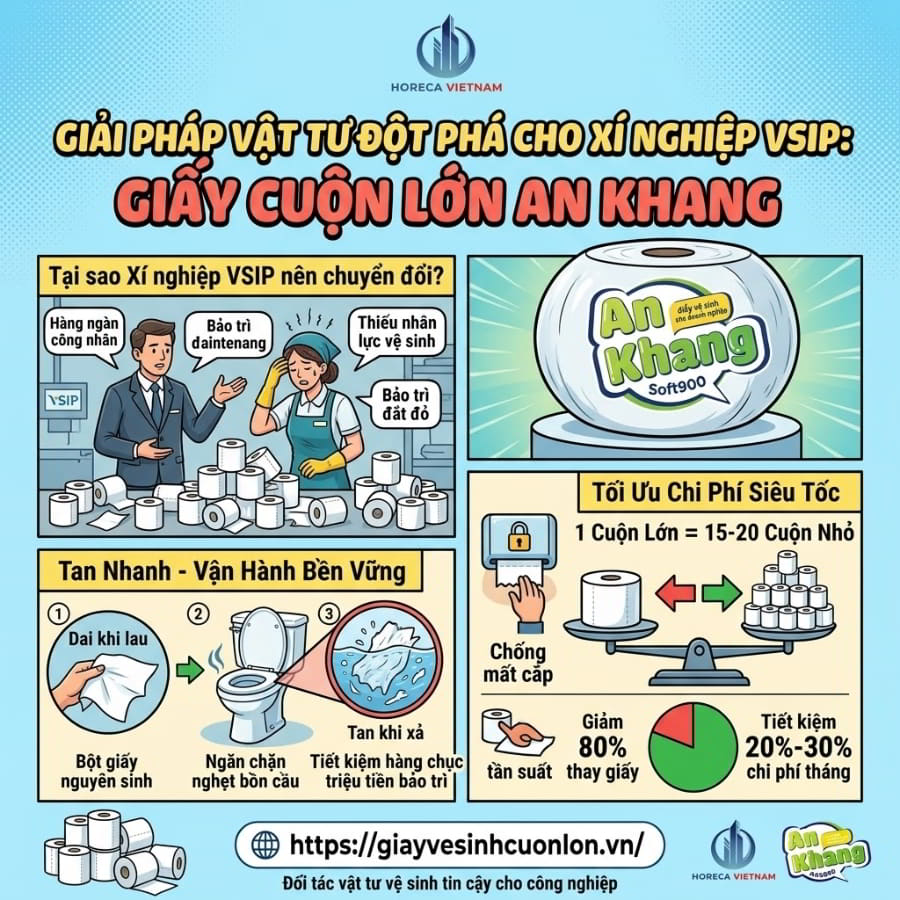 Sự thật là việc lựa chọn sai nguồn cung cấp giấy vệ sinh cho KCN VSIP đang âm thầm bào mòn hàng chục triệu đồng chi phí vận hành mỗi năm của các nhà máy. Nắm bắt được nỗi đau đó, Horeca Việt Nam mang đến giải pháp vật tư toàn diện, giúp bạn kiểm soát ngân sách triệt để và kiến tạo môi trường làm việc chuẩn quốc tế.