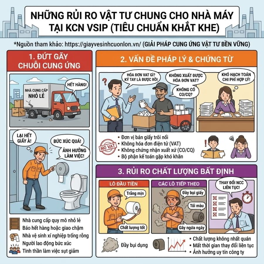 Nằm ở vị trí trung tâm công nghiệp của Bình Dương, các nhà máy tại VSIP luôn đòi hỏi tiêu chuẩn cung ứng vô cùng khắt khe. Tuy nhiên, nhiều phòng mua hàng (Purchasing) vẫn đang mắc kẹt trong vòng luẩn quẩn của các rủi ro vật tư. Thứ nhất là rủi ro đứt gãy chuỗi cung ứng. Một nhà cung cấp quy mô nhỏ lẻ sẽ thường xuyên báo “hết hàng” hoặc giao chậm, khiến nhà vệ sinh xí nghiệp rơi vào tình trạng trống rỗng, gây bức xúc cho người lao động và ảnh hưởng đến tinh thần làm việc.