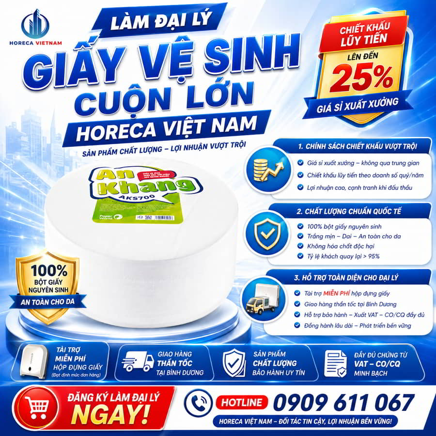 Chính sự chuyển dịch này đã tạo ra một thị trường ngách đầy tiềm năng. Nếu bạn đang tìm kiếm cơ hội trở thành đại lý giấy vệ sinh cuộn lớn bình dương tận gốc, không qua trung gian, chiết khấu khủng và được hỗ trợ toàn diện, thì Horeca Việt Nam chính là bệ phóng hoàn hảo dành cho bạn. Khám phá ngay chính sách tuyển đại lý cấp 1 độc quyền của chúng tôi!