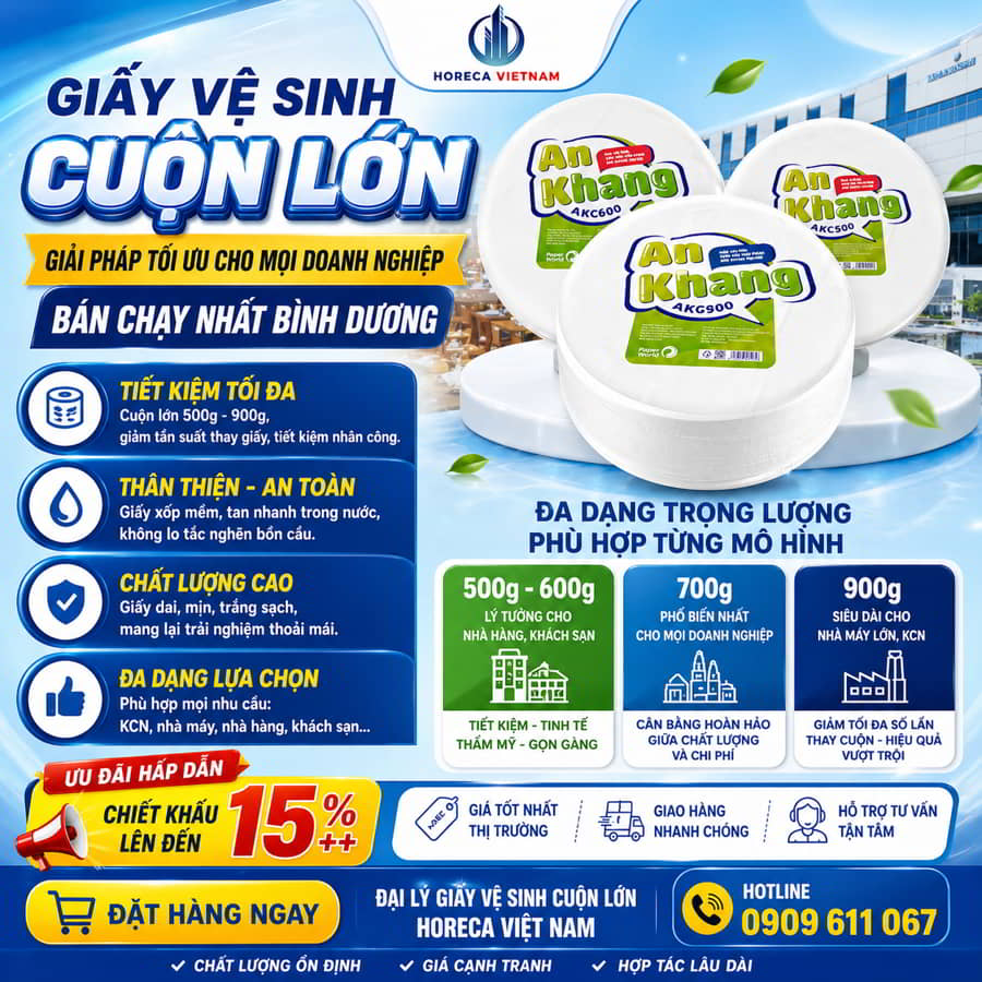 Để được tư vấn chi tiết về dịch vụ giao hàng tận nơi và thiết kế gói chính sách chiết khấu đại lý giấy vệ sinh cuộn lớn Bình Dương linh hoạt – được “may đo” riêng cho từng quy mô (từ các cơ sở phân phối vừa và nhỏ đến hệ thống cung ứng cho KCN quy mô hàng ngàn công nhân), Quý khách hàng và đối tác vui lòng liên hệ ngay với Horeca Việt Nam qua hotline 0909 611 067. Đội ngũ chuyên gia của chúng tôi luôn sẵn sàng hỗ trợ nhanh chóng và mang đến bảng báo giá cạnh tranh nhất thị trường.