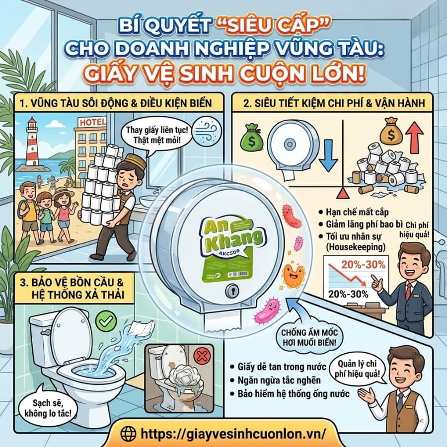 Vũng Tàu là một trong những thủ phủ du lịch sôi động nhất cả nước. Lượng du khách lưu trú ngắn ngày rất lớn, kéo theo tần suất sử dụng khu vực vệ sinh công cộng tăng vọt. Trong môi trường này, những cuộn giấy nhỏ truyền thống bộc lộ rõ điểm yếu: hết quá nhanh, lõi giấy vứt ngổn ngang và mất rất nhiều công sức để nhân viên thay thế liên tục. Đặc biệt, hơi muối biển đặc trưng tại Vũng Tàu rất dễ làm giấy vệ sinh bị ẩm mốc nếu không được bảo vệ đúng cách. Sử dụng giấy vệ sinh cuộn lớn kết hợp với hộp đựng chuyên dụng, kín đáo chính là bí quyết giúp các khách sạn và chuỗi F&B duy trì sự sang trọng, giữ giấy luôn khô ráo và nâng cao trải nghiệm của khách hàng một cách tinh tế nhất.