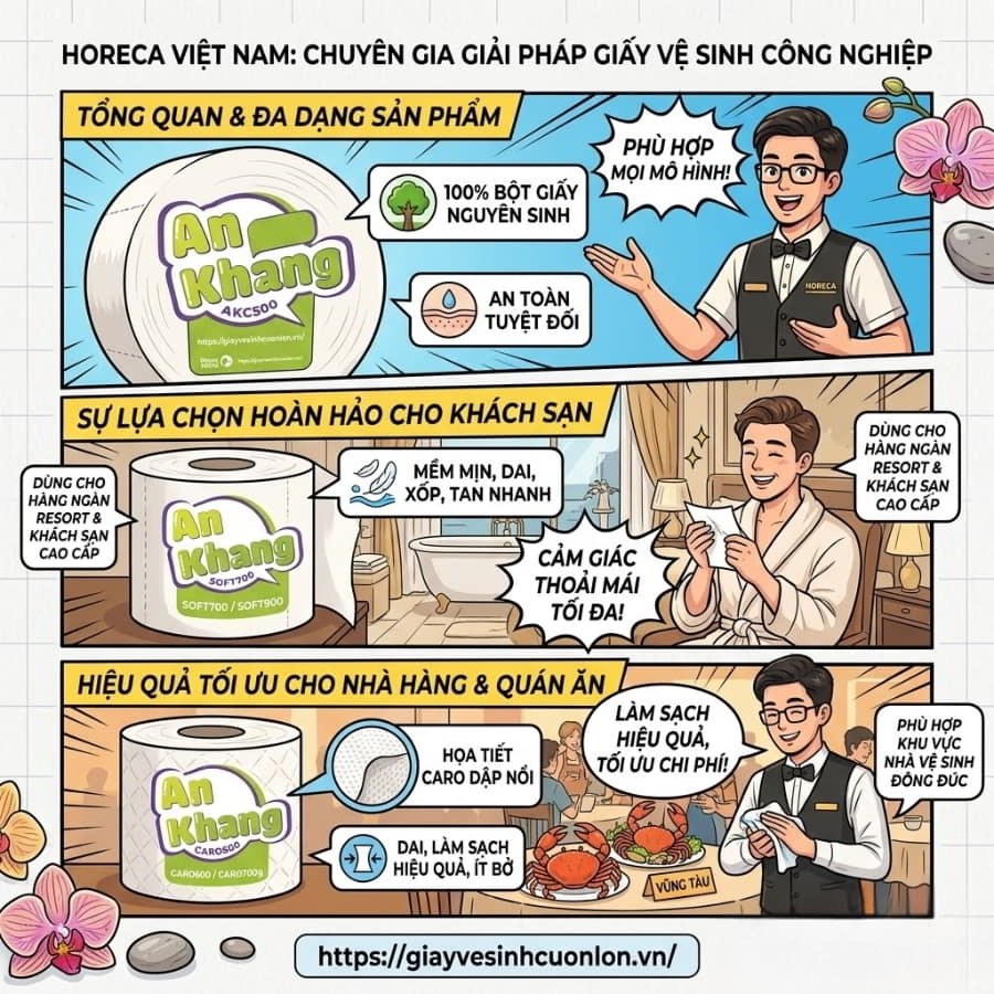 Đừng để những cuộn giấy kém chất lượng làm bôi bẩn hình ảnh dịch vụ của bạn thêm một ngày nào nữa. Nếu doanh nghiệp của bạn đang khát khao tìm kiếm một nguồn cung cấp giấy vệ sinh cuộn to uy tín, cam kết làm từ 100% bột giấy nguyên sinh, tan nhanh chống tắc nghẽn cùng mức giá sỉ cực tốt ngay tại Vũng Tàu, hãy truy cập ngay website giayvesinhcuonlon.vn hoặc gọi trực tiếp cho Horeca Việt Nam. Đặt hàng ngay hôm nay để nhận đặc quyền tài trợ hộp đựng giấy cao cấp hoàn toàn miễn phí và tận hưởng dịch vụ giao hàng tận cửa hỏa tốc nhất!