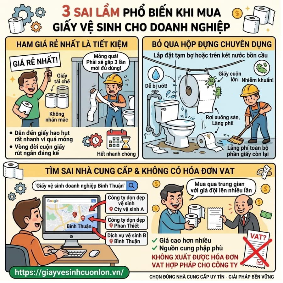 Sai lầm thứ hai là việc bỏ qua hệ thống hộp đựng chuyên dụng. Đặt trực tiếp cuộn giấy khổng lồ lên két nước bồn cầu hoặc móc tạm bợ khiến giấy rất dễ bị ướt, nhiễm khuẩn, hoặc rơi xuống sàn nhà gây lãng phí toàn bộ phần giấy còn lại. Đặc biệt, nếu tìm kiếm sai nhà cung cấp (Google hiện đang nhầm lẫn hiển thị rất nhiều công ty dọn dẹp vệ sinh thành nơi bán giấy tại Bình Thuận), bạn sẽ phải mua qua trung gian với giá đội lên nhiều lần, nguồn cung phập phù và không thể xuất được hóa đơn VAT hợp pháp cho công ty.