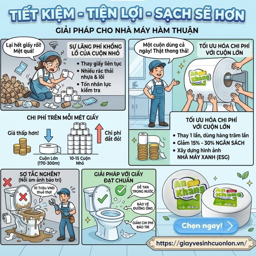 Trong môi trường có hàng trăm, thậm chí hàng ngàn lao động như các khu công nghiệp tại Hàm Thuận, việc sử dụng giấy vệ sinh cuộn nhỏ truyền thống là một sự lãng phí khổng lồ về cả ngân sách lẫn nhân lực. Giấy vệ sinh cuộn lớn (hay còn gọi là giấy vệ sinh công nghiệp) là loại giấy có kích thước và trọng lượng lớn từ 500g đến 1000g/cuộn, với chiều dài mỗi cuộn từ 170 đến 300m giấy.