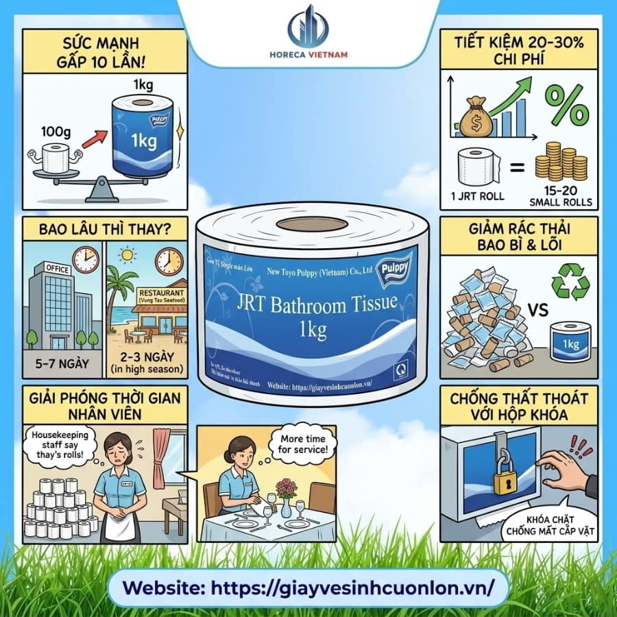 Hiệu ứng bầy đàn trong giới quản lý nhà hàng – khách sạn hiện nay rất rõ ràng: Khi một Resort 5 sao cắt giảm được 30% nhân sự bảo trì toilet chỉ nhờ việc lắp đặt cuộn giấy 1kg kèm hộp chuyên dụng, các cơ sở khác ngay lập tức học hỏi. Giấy vệ sinh công nghiệp (Jumbo Roll) loại 1kg là kích cỡ lớn nhất và tối ưu nhất trên thị trường hiện tại. Nó biến một công việc lặp đi lặp lại hàng ngày (thay giấy) thành một tác vụ chỉ cần thực hiện 1-2 lần mỗi tuần.