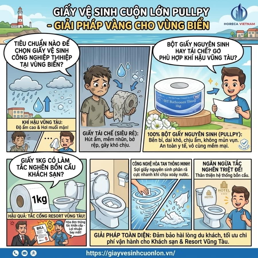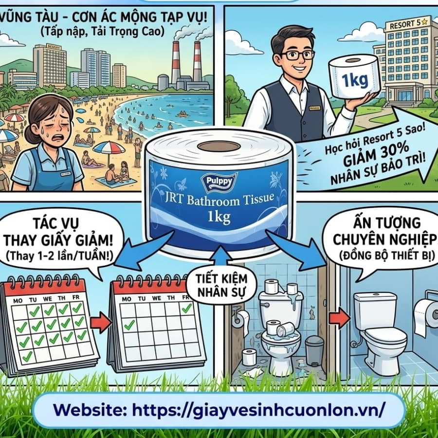 Thành phố biển Vũng Tàu mỗi dịp cuối tuần hay lễ Tết luôn rơi vào tình trạng “cháy phòng” và các nhà hàng hải sản thì nườm nượp thực khách. Đứng đằng sau sự hào nhoáng đó là nỗi ám ảnh không tên của các quản lý cơ sở vật chất và đội ngũ buồng phòng: Nhà vệ sinh liên tục hết giấy! Nếu bạn đang quản lý một cơ sở dịch vụ lưu trú hay F&B tại đây, hẳn bạn đã từng mệt mỏi với việc phải mua lắt nhắt từng lốc giấy nhỏ, vừa tốn kém, vừa rác không gian lưu trữ, lại cộng thêm phí vận chuyển từ các nhà phân phối không chính thức.