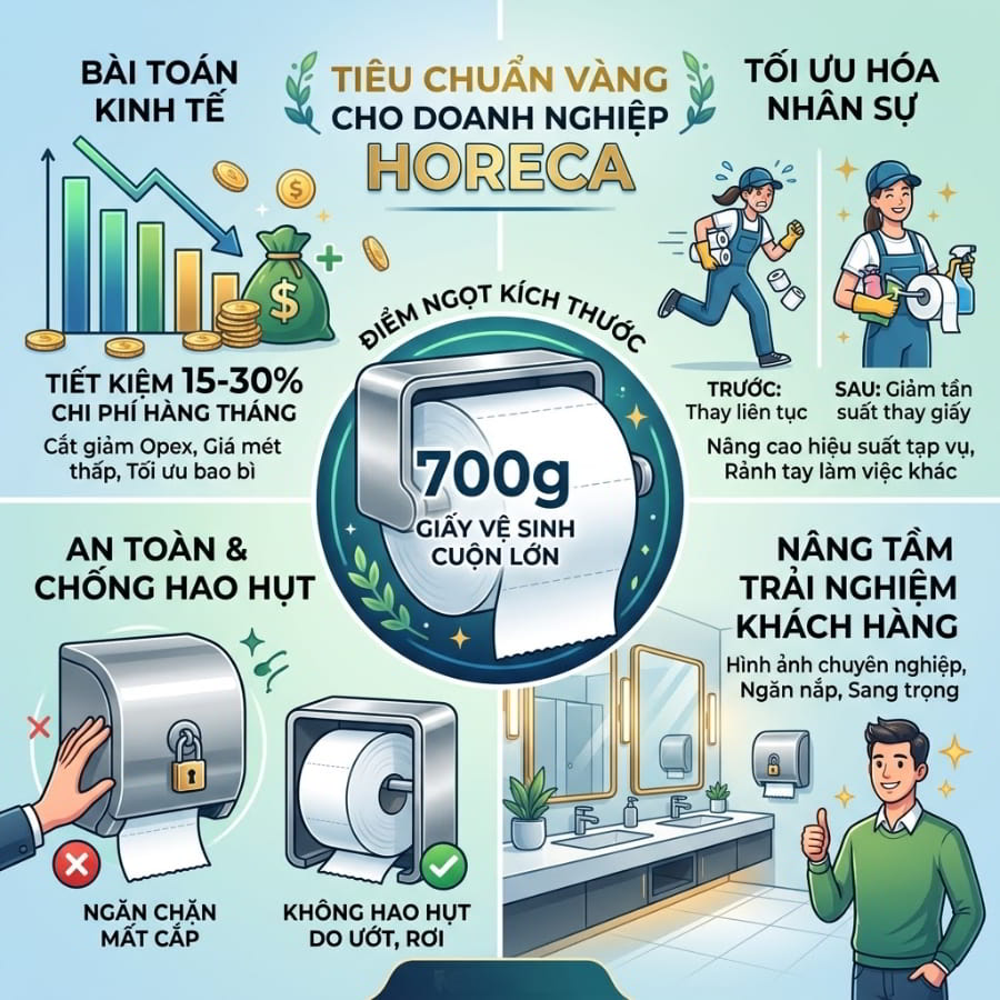 Sử dụng cuộn 700g sẽ làm thay đổi hoàn toàn cục diện. Việc giảm tần suất thay thế giúp ít phải kiểm tra thường xuyên, tối ưu nguồn lực vận hành và nhân sự vệ sinh. Nhân viên tạp vụ có thể dành thời gian đó để làm sạch bề mặt, khử mùi hoặc chăm sóc các khu vực sảnh chính. Đồng thời, doanh nghiệp cũng loại bỏ được rủi ro “hết giấy giữa chừng” gây bất tiện và những lời phàn nàn từ phía khách hàng hay đối tác.