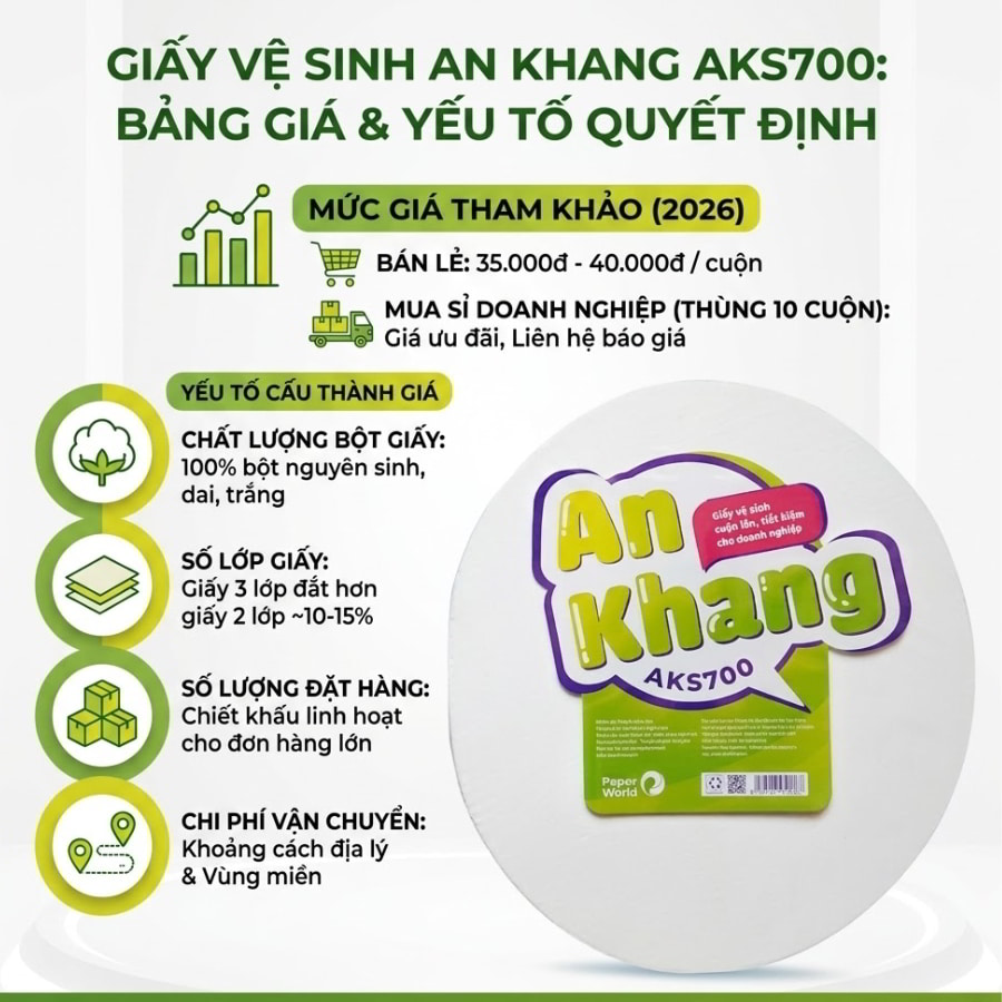 Giá giấy vệ sinh cuộn lớn luôn là yếu tố được doanh nghiệp quan tâm hàng đầu để tìm kiếm nguồn cung tiết kiệm. Dựa trên khảo sát thị trường mới nhất năm 2026, giá của giấy vệ sinh cuộn lớn 700g dao động phổ biến trong khoảng từ 35.000 VNĐ đến 40.000 VNĐ cho mỗi cuộn.