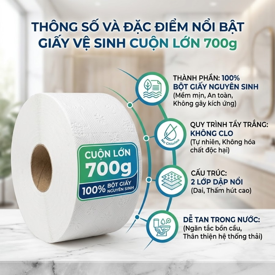Giấy vệ sinh cuộn lớn 700g có thông số kỹ thuật và đặc điểm gì nổi bật?