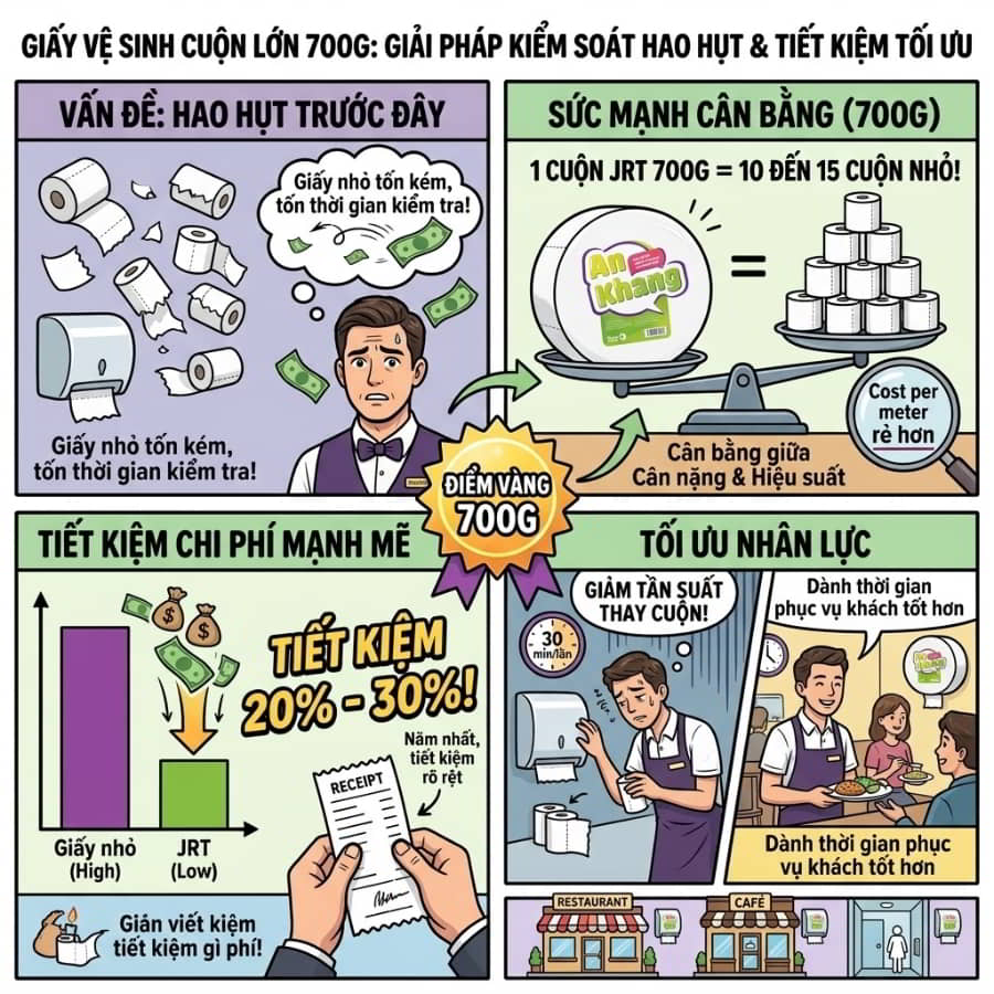 Để chấm dứt tình trạng hao hụt vật tư không kiểm soát, sự chuyển đổi sang các dòng giấy công nghiệp là điều bắt buộc. Một cuộn giấy vệ sinh cuộn lớn với trọng lượng 700g mang lại chiều dài và khối lượng tương đương từ 10 đến 15 cuộn giấy nhỏ thông thường. Việc này mang lại một hiệu ứng tích cực ngay lập tức: giảm thiểu tối đa tần suất phải thay cuộn của nhân viên dọn dẹp. Thay vì phải chầu chực kiểm tra mỗi 30 phút, nhân sự của bạn có thể dành thời gian đó để phục vụ khách hàng tốt hơn.