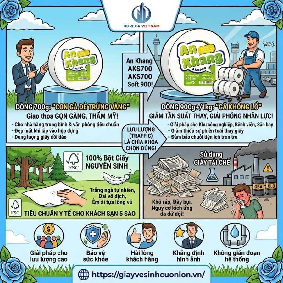 Đứng trước danh mục giấy vệ sinh cuộn lớn đa dạng, các nhà quản lý thường rơi vào ma trận phân vân không biết nên chọn định lượng nào để tối ưu hóa bài toán kinh tế. Câu trả lời chuẩn xác nhất không nằm ở việc cuộn nào rẻ hơn, mà phụ thuộc hoàn toàn vào lưu lượng người sử dụng thực tế (traffic) tại cơ sở kinh doanh của bạn.