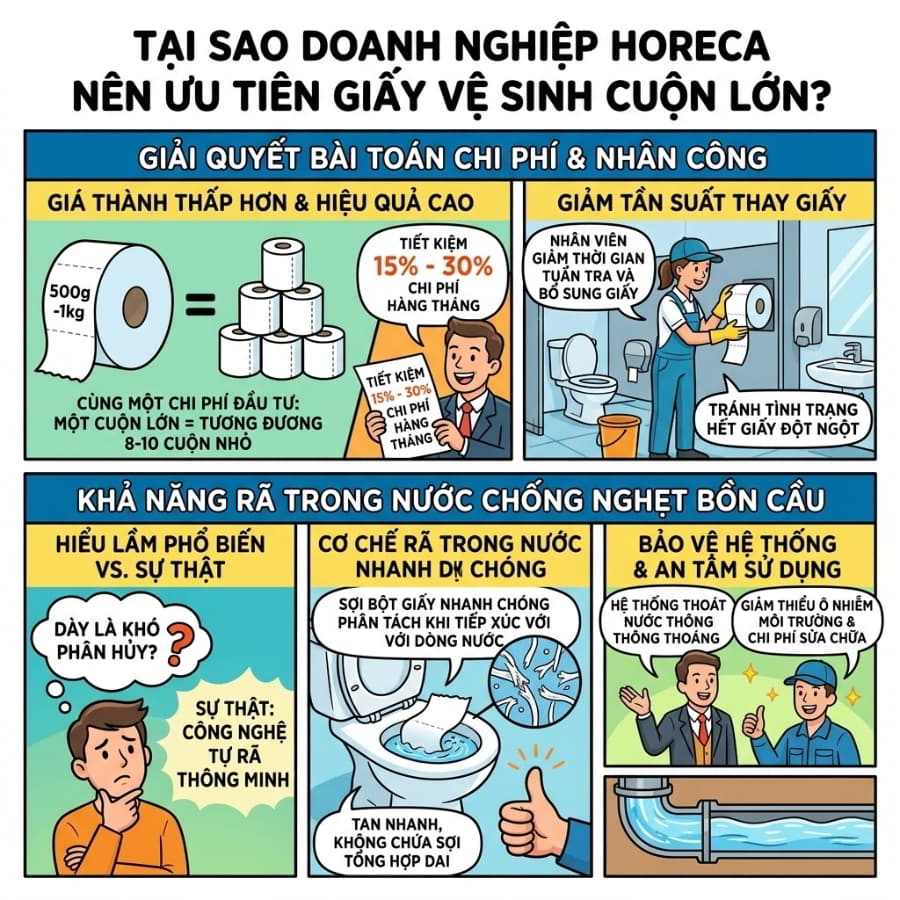 Bạn đang đau đầu vì ngân sách vật tư tiêu hao hàng tháng của nhà hàng, khách sạn hay tòa nhà văn phòng liên tục vượt định mức? Bạn mệt mỏi với những lời phàn nàn về việc bồn cầu bị tắc nghẽn do khách hàng sử dụng giấy vệ sinh kém chất lượng? Hoặc đơn giản, nhân viên tạp vụ của bạn đang mất quá nhiều thời gian chỉ để đi thay những cuộn giấy vệ sinh nhỏ xíu trong hàng chục phòng toilet mỗi ngày?