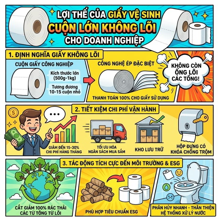 Trong bối cảnh bài toán tối ưu hóa chi phí và phát triển bền vững lên ngôi, một giải pháp tưởng chừng nhỏ bé nhưng mang lại hiệu quả khổng lồ đã xuất hiện: Giấy vệ sinh cuộn lớn không lõi. Hãy cùng khám phá sự thật đằng sau thiết kế thông minh này và xem liệu nó có xứng đáng để bạn thay đổi thói quen mua sắm của doanh nghiệp mình hay không.