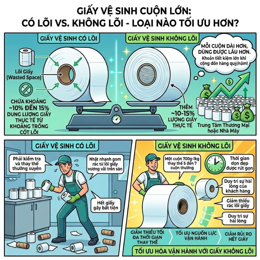 So sánh giấy vệ sinh cuộn lớn không lõi và có lõi loại nào tối ưu hơn?