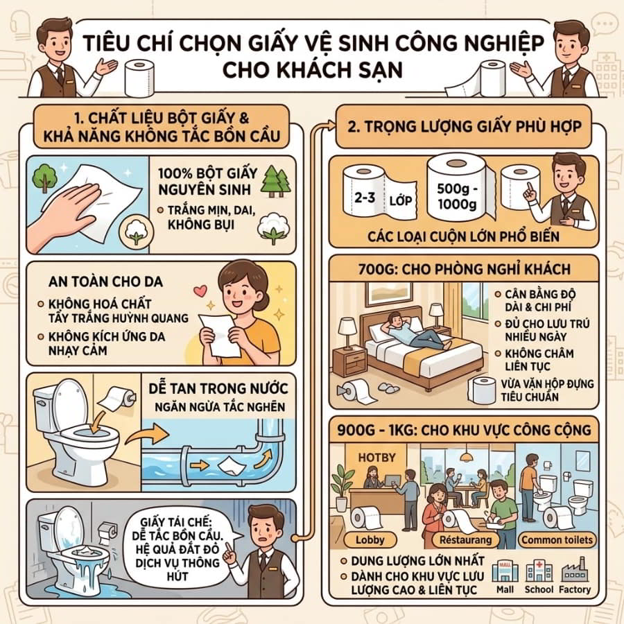 Chất lượng của tờ giấy vệ sinh quyết định trực tiếp đến cảm nhận của khách hàng về đẳng cấp của khách sạn. Đối với các cơ sở lưu trú cao cấp, tiêu chuẩn bắt buộc là phải sử dụng giấy sản xuất từ 100% bột giấy nguyên sinh. Giấy vệ sinh từ 100% bột giấy nguyên sinh có giá cao hơn, nhưng bù lại trắng mịn, dai, không bụi, an toàn cho da và sức khỏe người dùng. Những sản phẩm này tuyệt đối không chứa hóa chất tẩy trắng huỳnh quang, đảm bảo không gây kích ứng ngay cả với làn da nhạy cảm nhất.