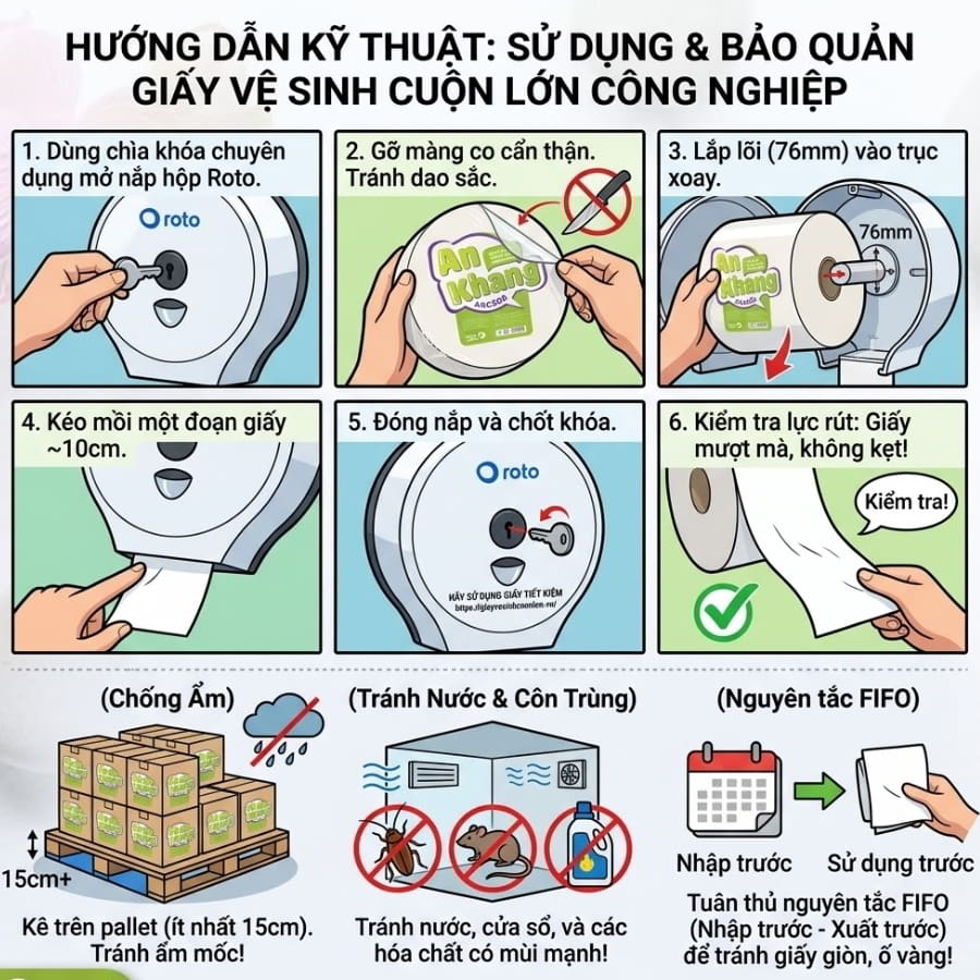 Hướng dẫn kỹ thuật: Sử dụng và bảo quản giấy vệ sinh cuộn lớn công nghiệp đúng chuẩn?