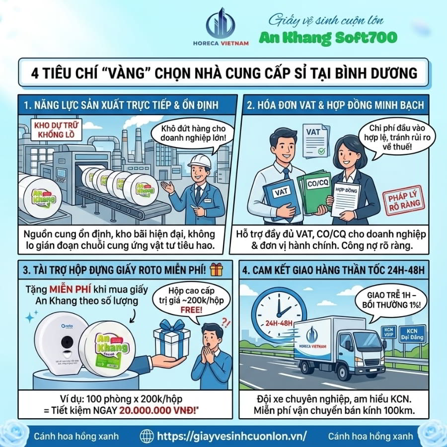Đừng chần chừ bỏ lỡ cơ hội nâng cấp toàn diện hệ thống vật tư tiêu hao của doanh nghiệp bạn ngay hôm nay. Nếu bạn đang tìm kiếm một đối tác cung cấp giấy vệ sinh cuộn lớn cao cấp, cam kết chất lượng 100% bột giấy nguyên sinh an toàn, chống nghẹt bồn cầu tuyệt đối với mức giá sỉ tận gốc tại khu vực Bình Dương, hãy truy cập ngay website giayvesinhcuonlon.vn hoặc liên hệ trực tiếp với Horeca Việt Nam để được đội ngũ chuyên gia tư vấn tận tình. Đặt hàng ngay để chớp lấy ưu đãi tài trợ hộp đựng giấy bảo vệ chuyên dụng 0 đồng và trải nghiệm dịch vụ thi công, giao hàng hỏa tốc tận nơi!