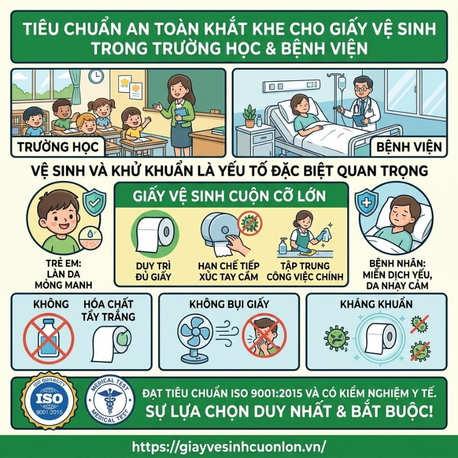 Tại bệnh viện, người bệnh có hệ miễn dịch yếu và làn da nhạy cảm. Tại trường mầm non hay tiểu học, làn da của trẻ em vô cùng mỏng manh. Do đó, tiêu chí “Không hóa chất tẩy trắng – Không bụi giấy – Kháng khuẩn” được đặt lên hàng đầu. Các loại giấy công nghiệp đạt tiêu chuẩn ISO 9001:2015, có kiểm nghiệm y tế là sự lựa chọn duy nhất và bắt buộc cho phân khúc này.