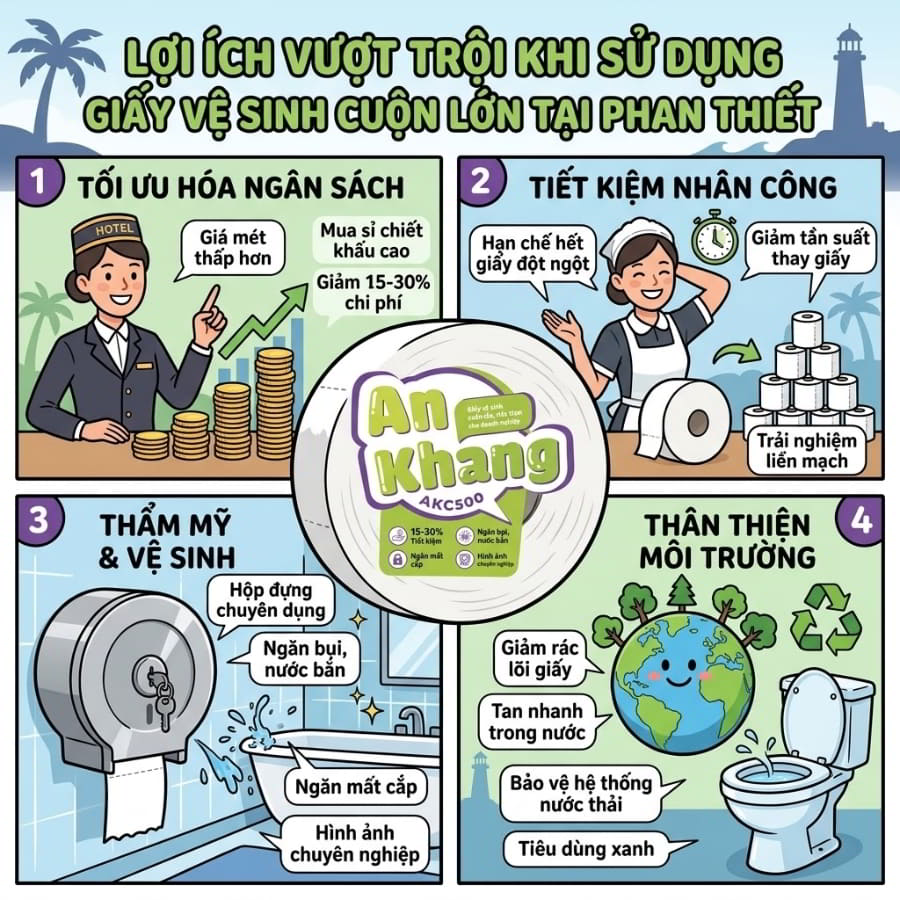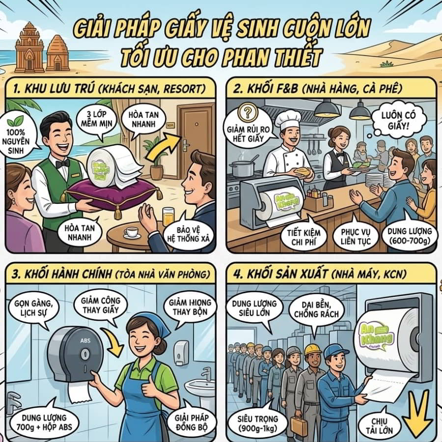 Thành phố biển Phan Thiết, Bình Thuận đang trải qua giai đoạn bùng nổ mạnh mẽ về du lịch, dịch vụ lưu trú, ẩm thực và các khu công nghiệp quy mô. Cùng với sự gia tăng không ngừng của lượng du khách và người lao động, các doanh nghiệp, nhà hàng, khách sạn và tổ chức tại đây luôn phải đối mặt với bài toán tối ưu hóa chi phí vận hành, đặc biệt là ngân sách dành cho vật tư tiêu hao hàng ngày. Trong bối cảnh đó, việc chuyển đổi từ các loại giấy vệ sinh cuộn nhỏ truyền thống sang giải pháp chuyên dụng hơn đang trở thành xu hướng tất yếu.