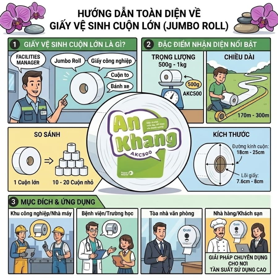 Để áp dụng hiệu quả vào mô hình kinh doanh, chúng ta cần hiểu rõ bản chất của sản phẩm này. Giấy vệ sinh cuộn lớn, hay còn được biết đến với tên gọi tiếng Anh là Jumbo Roll Toilet Paper, là dòng giấy vệ sinh có kích thước và trọng lượng vượt trội so với các loại giấy thông thường. Trong nhiều bối cảnh thuộc lĩnh vực thương mại và công cộng, sản phẩm này còn được gọi bằng các thuật ngữ chuyên ngành như giấy vệ sinh công nghiệp (Industrial Toilet Paper), giấy vệ sinh cuộn to, giấy vệ sinh cuộn tròn, hay giấy vệ sinh bánh xe.