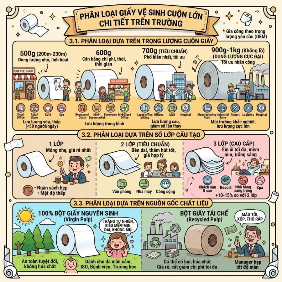 Để đáp ứng sự đa dạng trong quy mô hoạt động và cấu trúc chi phí của từng khách hàng, các nhà sản xuất đã chia giấy vệ sinh cuộn lớn thành nhiều phân khúc khác nhau. Việc hiểu rõ từng phân loại sẽ giúp quý khách hàng đưa ra quyết định mua sắm thông minh nhất.