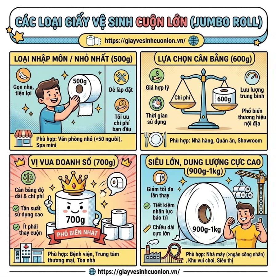 Thị trường giấy vệ sinh công nghiệp rất đa dạng để đáp ứng từng nhu cầu ngách của các cơ sở kinh doanh. Không có một loại giấy nào là “tốt nhất” cho tất cả, mà chỉ có loại giấy “phù hợp nhất” với quy mô và đặc thù của doanh nghiệp bạn. Để lựa chọn giấy vệ sinh cuộn tròn phù hợp, doanh nghiệp thường căn cứ vào trọng lượng cuộn và lưu lượng sử dụng thực tế.