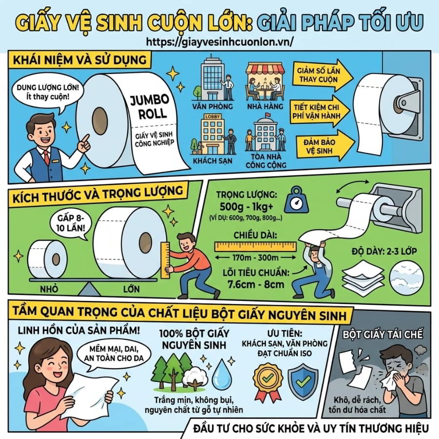 Giấy vệ sinh cuộn lớn (còn gọi là giấy cuộn jumbo, giấy vệ sinh công nghiệp) là loại giấy có kích thước và trọng lượng lớn hơn giấy vệ sinh cuộn nhỏ. Đây là giải pháp chuyên dụng được thiết kế cho các khu vực có tần suất sử dụng cao như văn phòng, nhà hàng, khách sạn và các tòa nhà công cộng. Nhờ dung lượng giấy lớn, dòng giấy cuộn lớn này giúp giảm số lần thay cuộn, tiết kiệm chi phí vận hành và đảm bảo vệ sinh khi sử dụng cùng hộp đựng chuyên dụng. Không chỉ đơn thuần là một cuộn giấy được phóng to, nó là kết quả của công nghệ sản xuất hiện đại nhằm tối ưu hóa vòng đời của sản phẩm tiêu hao, đáp ứng những yêu cầu khắt khe nhất của ngành công nghiệp dịch vụ và quản lý tòa nhà.