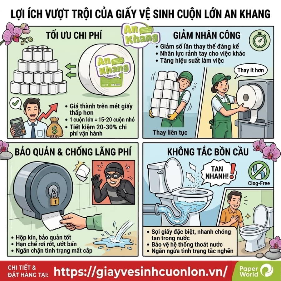 So với giấy vệ sinh cuộn nhỏ truyền thống, giấy vệ sinh cuộn lớn công nghiệp mang lại nhiều lợi ích rõ rệt, đặc biệt trong các môi trường có lưu lượng sử dụng cao và cần tối ưu chi phí vận hành. Không chỉ là một phép tính toán về mặt tài chính đơn thuần, lợi ích mà nó mang lại lan tỏa đến mọi khía cạnh của quy trình quản trị doanh nghiệp: từ bộ phận kế toán kiểm soát ngân sách, bộ phận buồng phòng tối ưu hóa hiệu suất làm việc, cho đến bộ phận marketing tự hào về một không gian dịch vụ hoàn hảo. Những ưu điểm này làm cho nó trở thành lựa chọn lý tưởng cho nhiều không gian và đối tượng sử dụng khác nhau.
