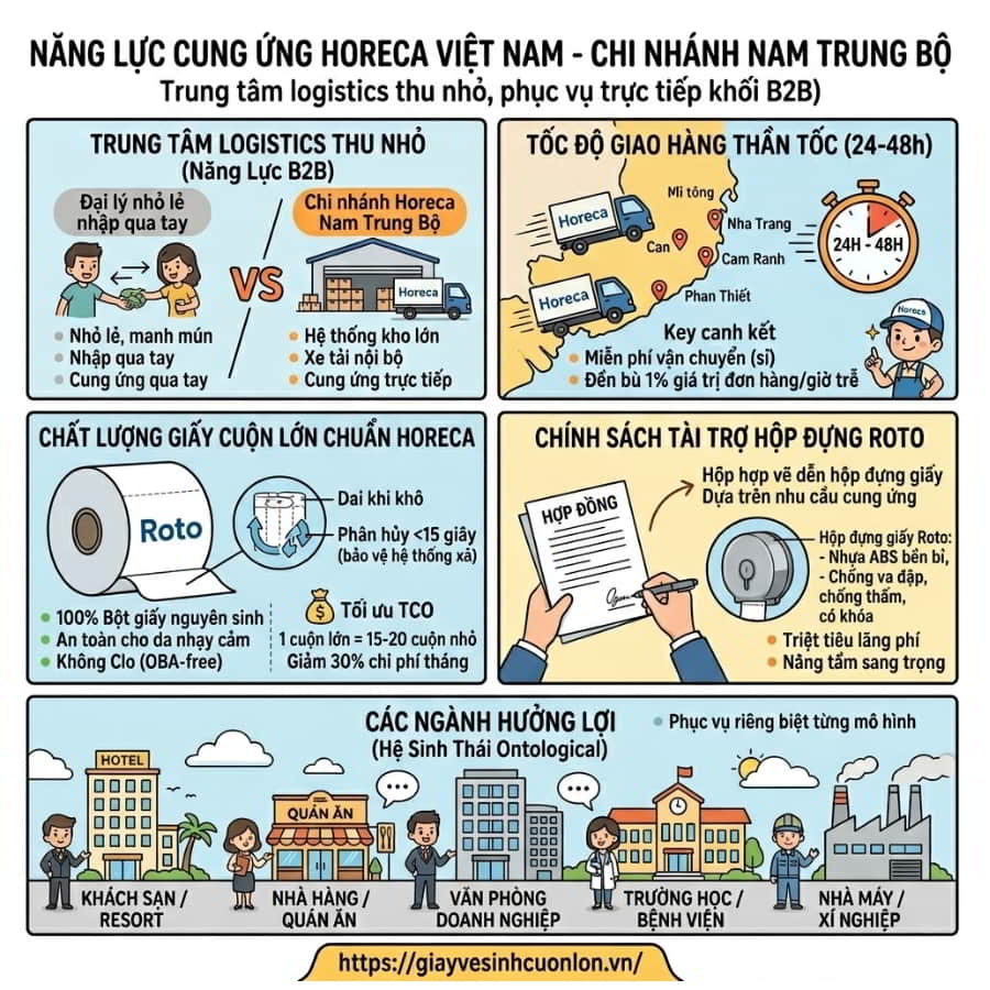 Đó là lúc bài toán về logistics và nhà cung ứng tại chỗ trở thành yếu tố sống còn. Hiểu được “nỗi đau” về chi phí vận chuyển đắt đỏ và thời gian chờ đợi kéo dài, sự hiện diện của giấy vệ sinh Horeca chi nhánh Nam Trung Bộ (trực thuộc Horeca Việt Nam) đã thiết lập lại toàn bộ tiêu chuẩn cung ứng tại khu vực Duyên hải miền Trung. Cùng mổ xẻ năng lực thực sự của tổng kho này và lý do vì sao hàng ngàn doanh nghiệp đang ráo riết chuyển đổi nhà cung cấp giấy vệ sinh cuộn lớn tai Phan Thiết.