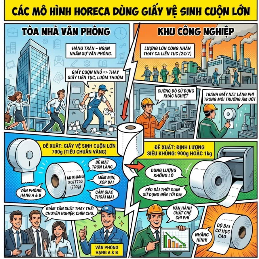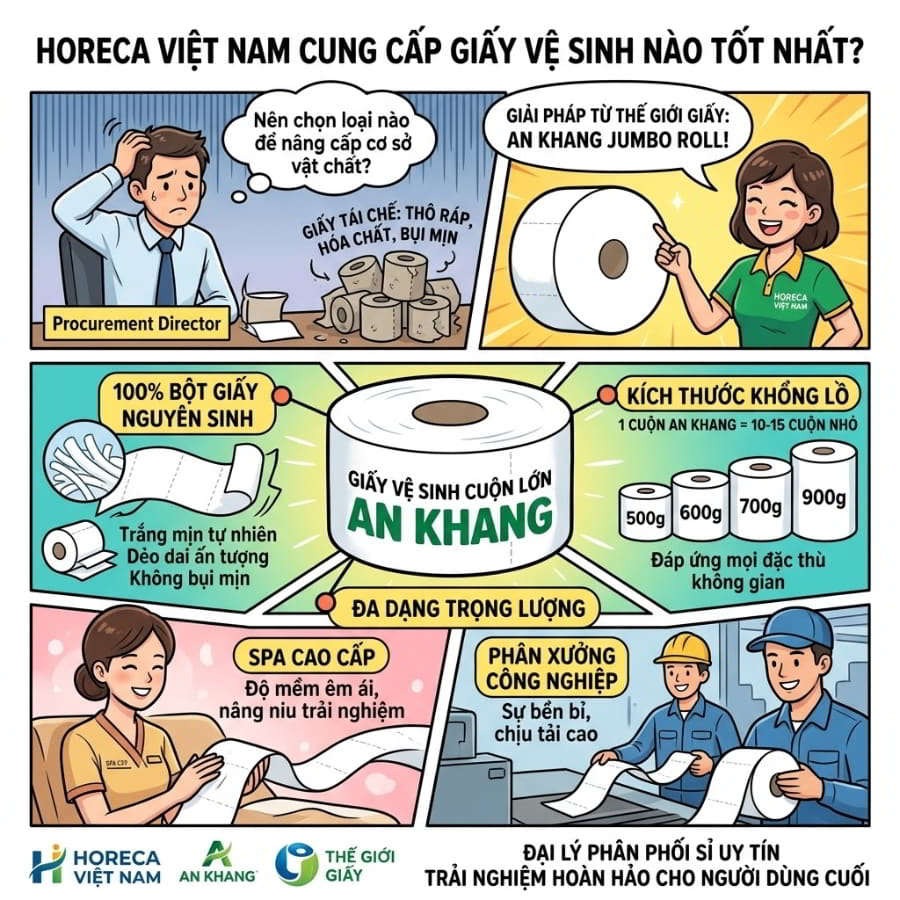 Khi nhắc đến việc nâng cấp cơ sở vật chất cho doanh nghiệp, câu hỏi đầu tiên mà các Giám đốc thu mua đặt ra là nên chọn dòng sản phẩm nào để vừa đạt chuẩn chất lượng vừa không vỡ ngân sách. Hiện nay, mảng vật tư tiêu hao B2B đang chứng kiến sự thống trị của dòng giấy vệ sinh cuộn lớn (hay còn gọi là Jumbo Roll). Với vai trò là một trong những mạng lưới phân phối trọng điểm, Horeca Việt Nam cung cấp giấy vệ sinh mang thương hiệu An Khang – “đứa con cưng” được sản xuất trực tiếp bởi Thế Giới Giấy.