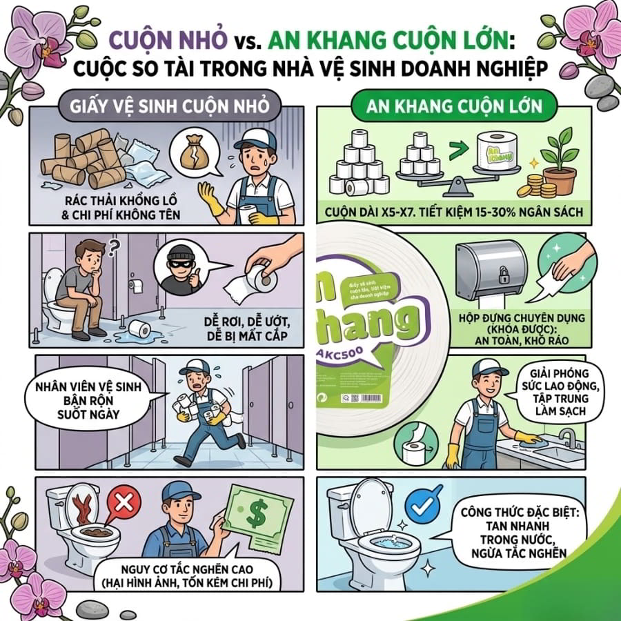 Ngược lại, giấy vệ sinh cuộn lớn An Khang là một cuộc cách mạng thực sự. Với chiều dài cuộn giấy lớn gấp 5 đến 7 lần, giải pháp này giúp doanh nghiệp giảm đáng kể chi phí vận hành, tiết kiệm trực tiếp từ 15% đến 30% ngân sách mua sắm hàng tháng. Bạn sẽ không còn thấy cảnh nhân viên vệ sinh phải túc trực liên tục để thêm giấy mới, từ đó giải phóng sức lao động để họ tập trung vào việc làm sạch chuyên sâu.