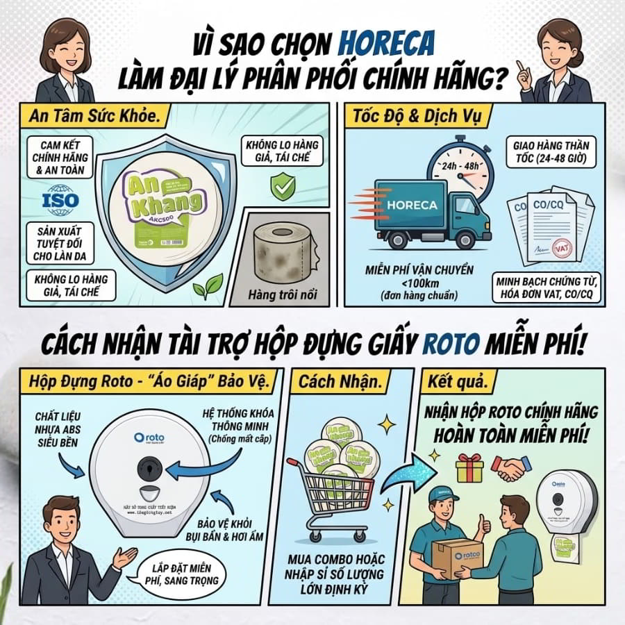 Được thiết kế từ chất liệu nhựa ABS nguyên sinh siêu bền hoặc inox cao cấp, hộp Roto giúp bảo vệ cuộn giấy khỏi bụi bẩn, hơi ẩm và chống mất cắp bằng hệ thống khóa an toàn thông minh. Điểm tuyệt vời là bạn không cần phải bỏ ra hàng chục triệu đồng để trang bị hệ thống hộp này. Khi bạn chốt đơn hàng mua theo combo hoặc nhập sỉ số lượng lớn định kỳ, nhà cung cấp sẵn sàng tặng hộp đựng giấy Roto chính hãng hoàn toàn MIỄN PHÍ. Sự kết hợp đồng bộ giữa cuộn giấy An Khang và hộp Roto không chỉ xóa sổ sự lãng phí mà còn biến không gian vệ sinh của bạn trở nên đẳng cấp, sang trọng. Hãy nắm bắt ngay cơ hội vàng này bằng cách tham khảo chính sách mua giấy sỉ và nhận tài trợ hộp đựng.