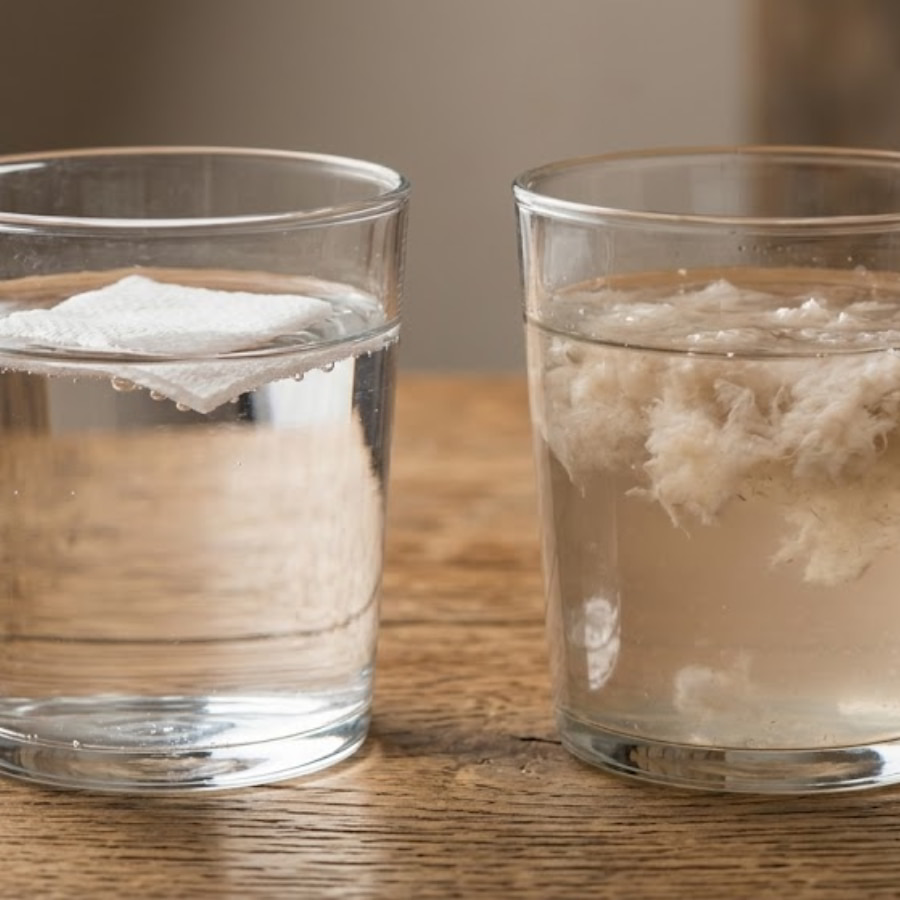 Đối với dòng giấy vệ sinh cao cấp từ bột nguyên sinh, cấu trúc sợi xenlulozo tự nhiên được dệt đan xen một cách khoa học. Khi tiếp xúc với nước, giấy sẽ từ từ thấm hút, trở nên mềm đi nhưng vẫn giữ nguyên được độ dai cơ bản và kết cấu mảng, không hề vỡ vụn ngay lập tức, đồng thời nước trong ly vẫn giữ được độ trong suốt. Ngược lại, giấy vệ sinh cuộn lớn được làm từ phế liệu bẩn, trải qua quá trình ngâm tẩm hóa chất tẩy mạnh và huỳnh quang đã bị phá hủy hoàn toàn cấu trúc sợi tự nhiên. Chỉ chưa đầy vài giây chạm nước, tờ giấy này sẽ lập tức bở ra, mủn nát thành những hạt bột lợn cợn như bùn. Tồi tệ hơn, nước trong ly sẽ nhanh chóng chuyển sang màu đục ngầu, thậm chí sủi bọt nhẹ. Đó chính là bằng chứng đanh thép cho thấy chất tẩy trắng, huỳnh quang và vô số hóa chất công nghiệp độc hại đang bị rửa trôi và hòa tan ra ngoài.