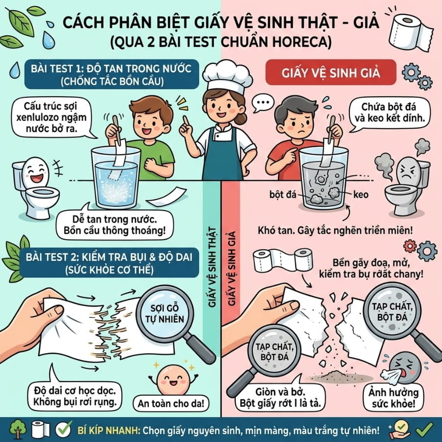 Bên cạnh việc kiểm tra chất lượng giấy (màu ngà, không bụi, tan tốt), bạn hãy chú ý đến bao bì. Hàng giả thường có màng co nilon mỏng, mờ, in chữ nhòe nhoẹt, sai lỗi chính tả. Lõi giấy ọp ẹp và đặc biệt là không có hóa đơn đỏ (VAT), không có tem mã vạch rõ ràng xuất xứ. Luôn mua tại các nhà phân phối chính thức như Horeca Việt Nam để được bảo vệ quyền lợi.
