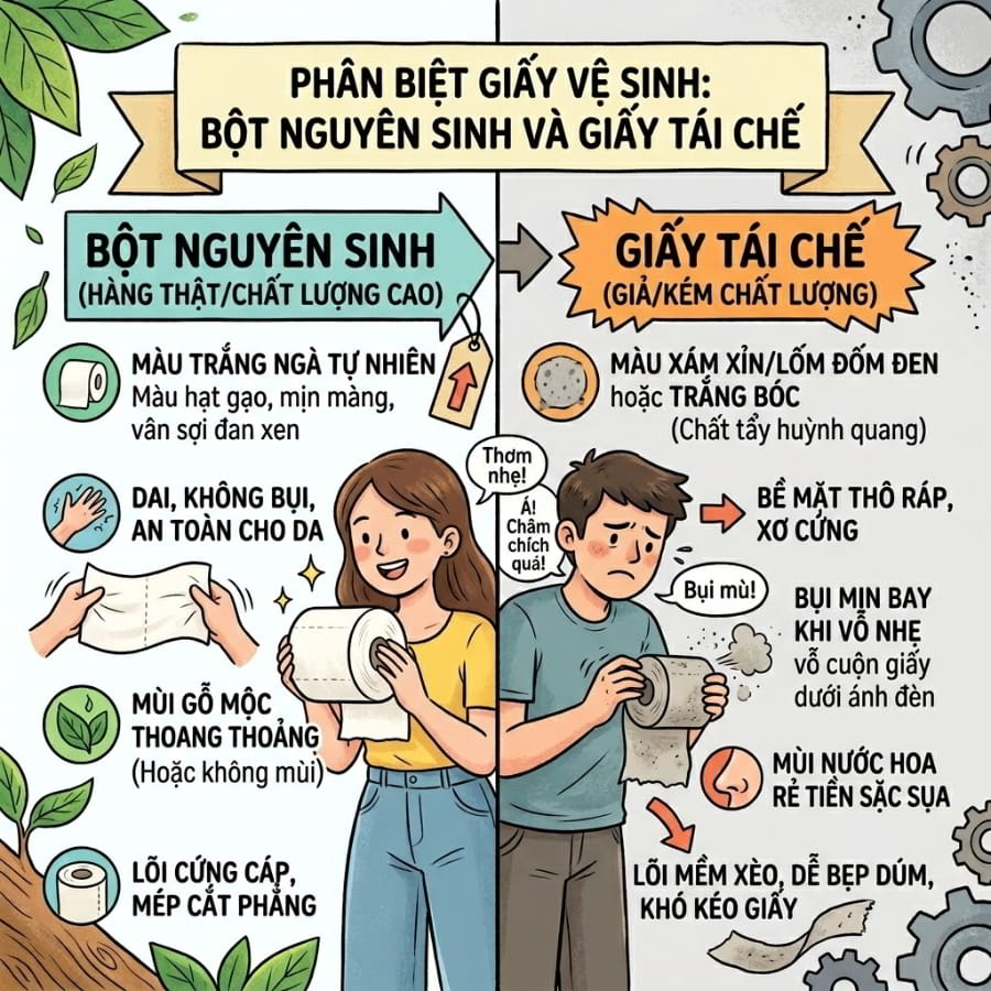 Cách Phân Biệt Giấy Vệ Sinh Cuộn Lớn Làm Từ Bột Giấy Nguyên Sinh Và Giấy Tái Chế