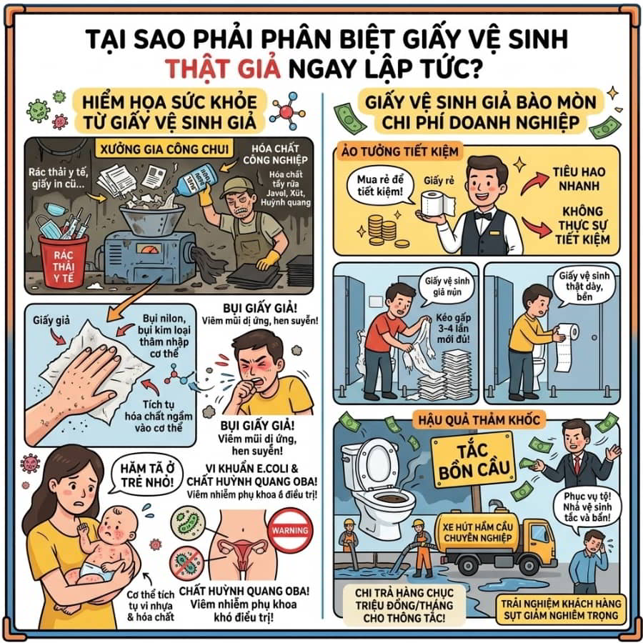 Bạn có biết, việc cố gắng tiết kiệm vài ngàn đồng để mua các lô giấy vệ sinh giá rẻ trôi nổi đang âm thầm “đốt” của bạn hàng triệu đồng tiền sửa chữa bồn cầu và chi phí y tế? Đa phần chúng ta chỉ nghĩ giấy vệ sinh thật giả là câu chuyện của việc nhái bao bì thương hiệu. Nhưng dưới góc độ của các chuyên gia sản xuất, “hàng giả” đáng sợ nhất chính là các loại giấy tái chế ngậm đầy hóa chất tẩy trắng, được đội lốt dưới mác “giấy cao cấp”. Cho dù bạn là một người mẹ đang mua sắm cho gia đình, hay một người quản lý mua hàng cho chuỗi khách sạn lớn, việc nắm vững cách phân biệt giấy vệ sinh thật giả là tấm khiên vững chắc nhất để bảo vệ sức khỏe và tối ưu chi phí.