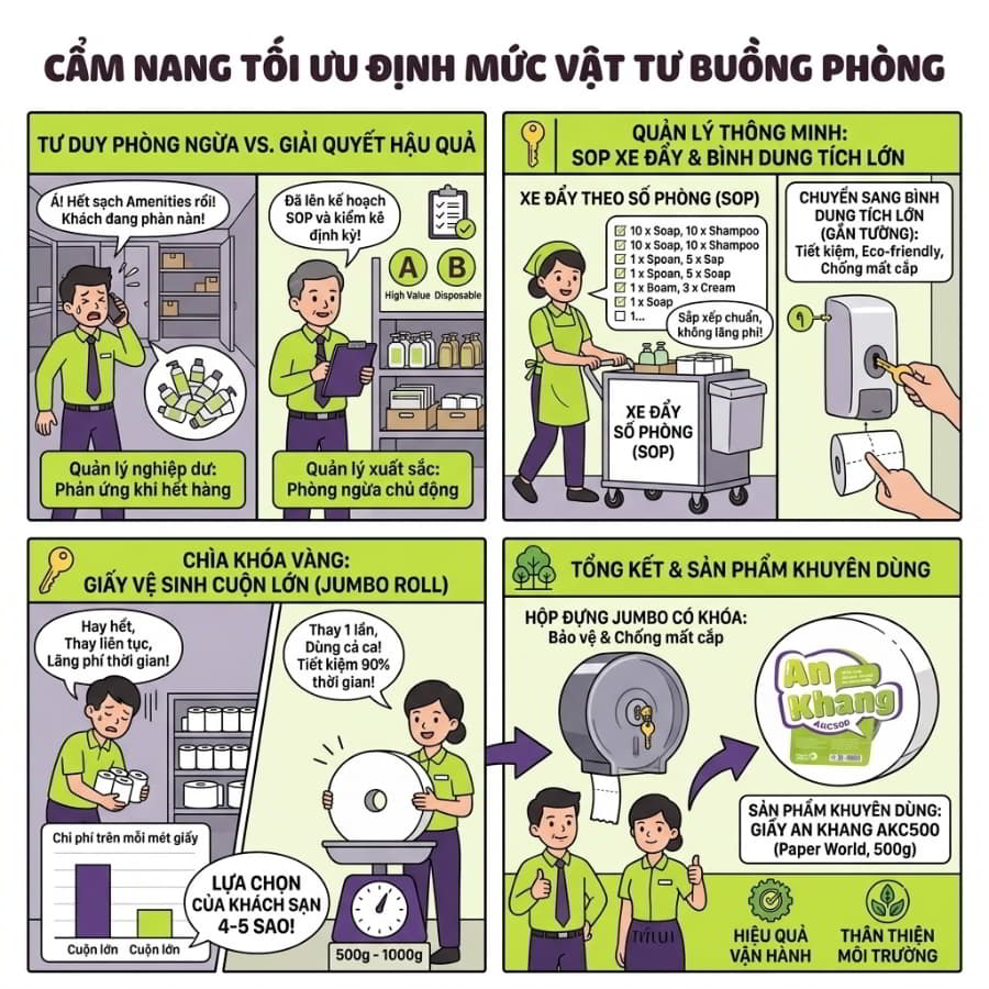 Với các vật tư như bàn chải, lược, dầu gội tuýp nhỏ, việc kiểm đếm đã khó. Nhưng rủi ro lớn nhất lại nằm ở những cuộn giấy vệ sinh nhỏ bé. Giấy vệ sinh cuộn nhỏ truyền thống hao hụt cực kỳ nhanh. Nhân viên buồng phòng phải thay liên tục, lõi giấy vứt đi tạo ra lượng rác khổng lồ. Nếu quản lý không có một định mức tiêu hao rõ ràng, chi phí vật tư sẽ âm thầm “ăn lẹm” vào lợi nhuận gộp của khách sạn. Tình trạng hết vật tư đột ngột không chỉ làm tăng khối lượng công việc cho nhân viên bảo trì, vệ sinh mà còn phá hủy nghiêm trọng trải nghiệm khách hàng.