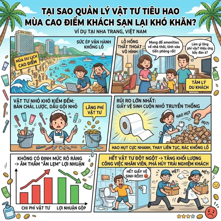 Nha Trang luôn là tâm điểm của bản đồ du lịch, đồng nghĩa với việc các khách sạn tại đây thường xuyên đối mặt với sức ép vận hành khổng lồ. Vấn đề lớn nhất không nằm ở việc bạn thiếu ngân sách mua hàng, mà nằm ở “Lỗ hổng thất thoát vô hình”. Theo nhiều nghiên cứu về tâm lý hành vi du khách, có một “hiệu ứng bầy đàn” ngầm định: du khách có xu hướng sử dụng lãng phí hơn hoặc mang đồ tiêu hao (amenities) về nhà khi họ ở trong khách sạn, vì họ cho rằng những thứ đó đã được tính vào tiền phòng.