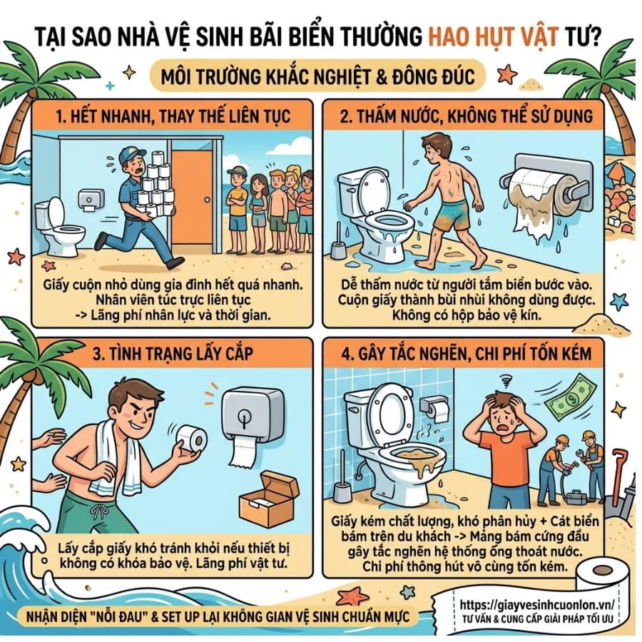 Đặc thù của các khu vực tắm nước ngọt ngoài trời hoặc nhà vệ sinh công cộng ven biển là môi trường luôn trong tình trạng ẩm ướt, kèm theo lưu lượng người sử dụng cực kỳ đông đúc. Sự kết hợp giữa nước biển, cát và gió mang theo hơi muối tạo ra một môi trường khắc nghiệt cho bất kỳ vật tư tiêu hao nào. Việc sử dụng các loại giấy vệ sinh cuộn nhỏ dùng trong gia đình là một sai lầm phổ biến mang lại nhiều hệ lụy.