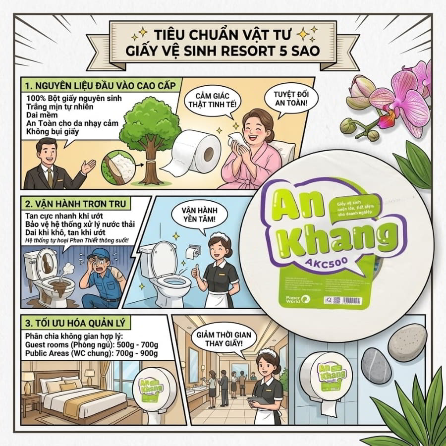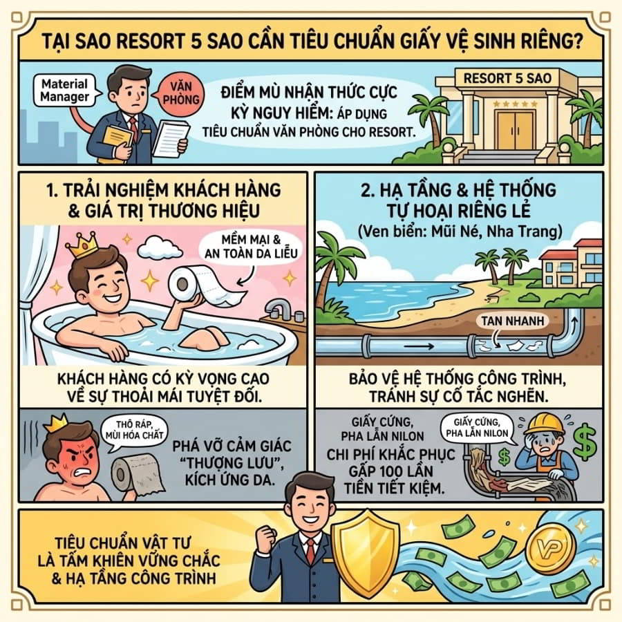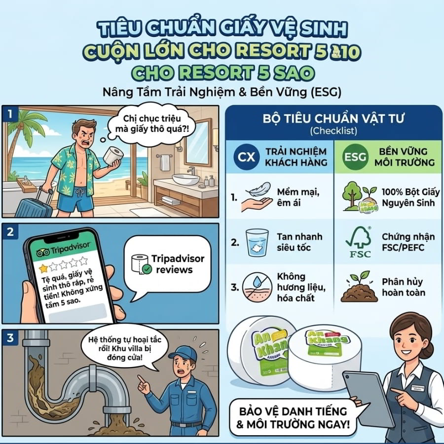 Hãy tưởng tượng một kịch bản tồi tệ: Khách hàng VIP chi trả hàng chục triệu đồng cho một đêm nghỉ dưỡng tại resort 5 sao ven biển Mũi Né, nhưng lại để lại đánh giá 1 sao trên TripAdvisor chỉ vì… cuộn giấy vệ sinh thô ráp, rẻ tiền làm họ khó chịu. Hoặc tồi tệ hơn, hệ thống tự hoại của toàn bộ khu villa bị tắc nghẽn giữa mùa cao điểm du lịch do sử dụng sai loại giấy. Đây không phải là viễn cảnh xa vời mà là thực tế đau đầu của rất nhiều Giám đốc buồng phòng (Executive Housekeeper).