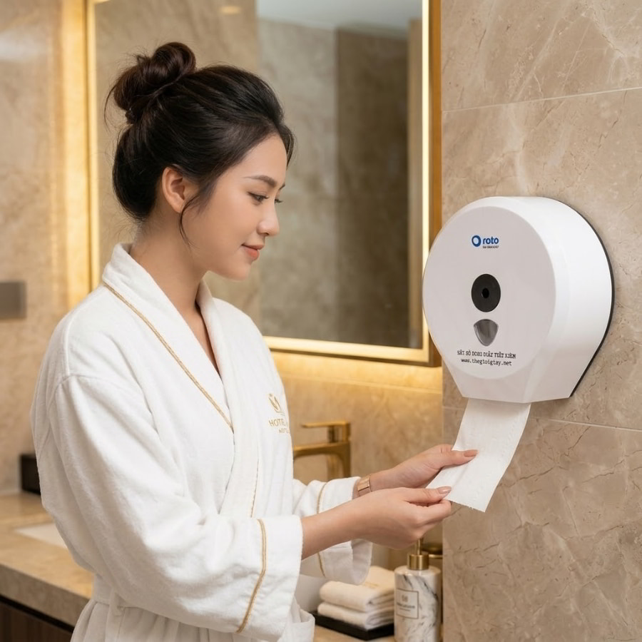 Nhiều người chỉ chú trọng bảo quản trong kho mà quên mất rằng, nhà vệ sinh – nơi sử dụng giấy trực tiếp – mới là môi trường có độ ẩm cao và độc hại nhất. Sử dụng hộp đựng giấy vệ sinh cuộn lớn là một trong những cách hiệu quả để bảo quản sản phẩm này. Hộp đựng chuyên dụng đóng vai trò như một chiếc khiên vững chắc, bao bọc và cách ly cuộn giấy khỏi hơi nước nóng từ vòi hoa sen, những tia nước bắn ra từ bồn rửa tay, và các vi khuẩn lơ lửng trong không khí.