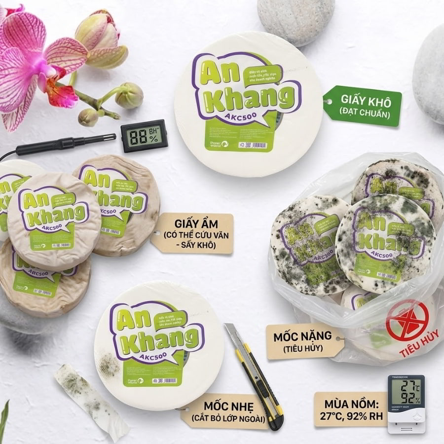 Tuyệt đối không mang giấy đi phơi dưới ánh nắng mặt trời gay gắt hoặc dùng máy sấy nhiệt độ cao. Hiệu ứng nhiệt đột ngột sẽ khiến sợi giấy bị giòn, cong vênh và đứt gãy cấu trúc tự nhiên. Thay vào đó, hãy đặt các cuộn giấy này trong một căn phòng kín, bật điều hòa ở chế độ Dry (hút ẩm) hoặc sử dụng máy hút ẩm chuyên dụng trong vòng 12 đến 24 giờ. Luồng không khí khô và mát sẽ nhẹ nhàng rút hơi ẩm ra khỏi giấy. Sau khi xử lý xong, lô giấy này cần được ưu tiên đưa vào sử dụng ngay lập tức tại các khu vực có lưu lượng người dùng cao để giải quyết hàng tồn.
