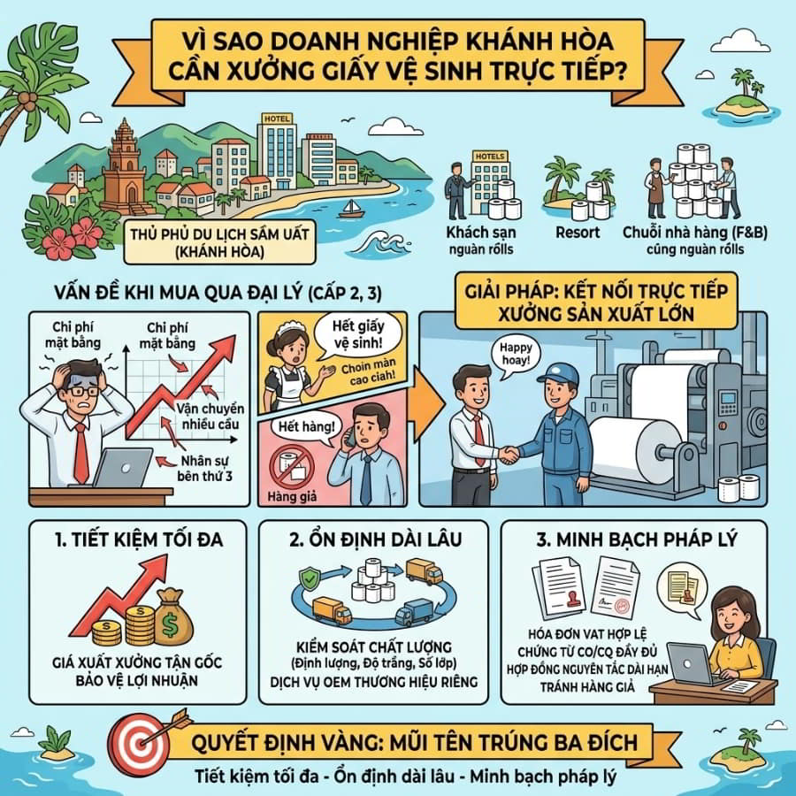 Trong bối cảnh nền kinh tế thị trường cạnh tranh khốc liệt, đặc biệt là tại một thủ phủ du lịch sầm uất như Khánh Hòa, việc tối ưu hóa mọi chi phí vận hành (OPEX) là quy luật sinh tồn. Các khách sạn, resort quy mô lớn hay chuỗi nhà hàng dịch vụ (F&B) thường tiêu thụ hàng nghìn cuộn giấy vệ sinh mỗi tháng. Nếu tiếp tục mua hàng từ các đại lý cấp 2, cấp 3, doanh nghiệp của bạn đang tự nguyện gánh thêm chi phí mặt bằng, chi phí vận chuyển qua nhiều cầu, và chi phí nhân sự của bên thứ ba. Hơn thế nữa, tính bất ổn trong chuỗi cung ứng là một hiệu ứng dây chuyền vô cùng nguy hiểm. Đã bao nhiêu lần vào mùa du lịch cao điểm, buồng phòng của bạn báo cáo thiếu hụt vật tư nhưng đại lý lại thông báo “cháy hàng”?
